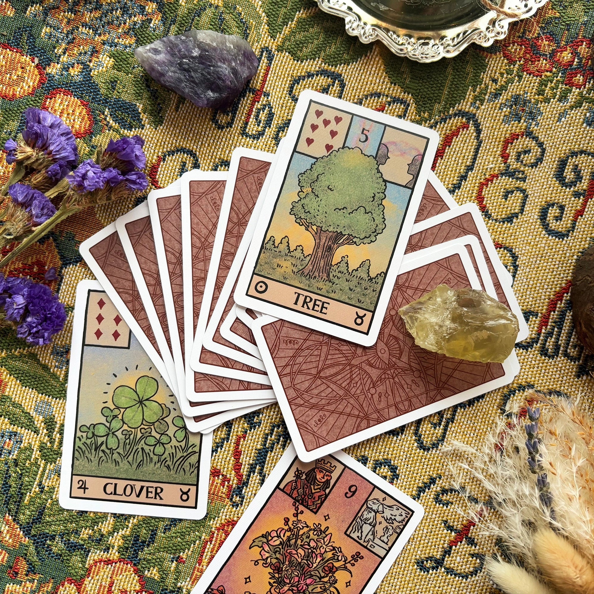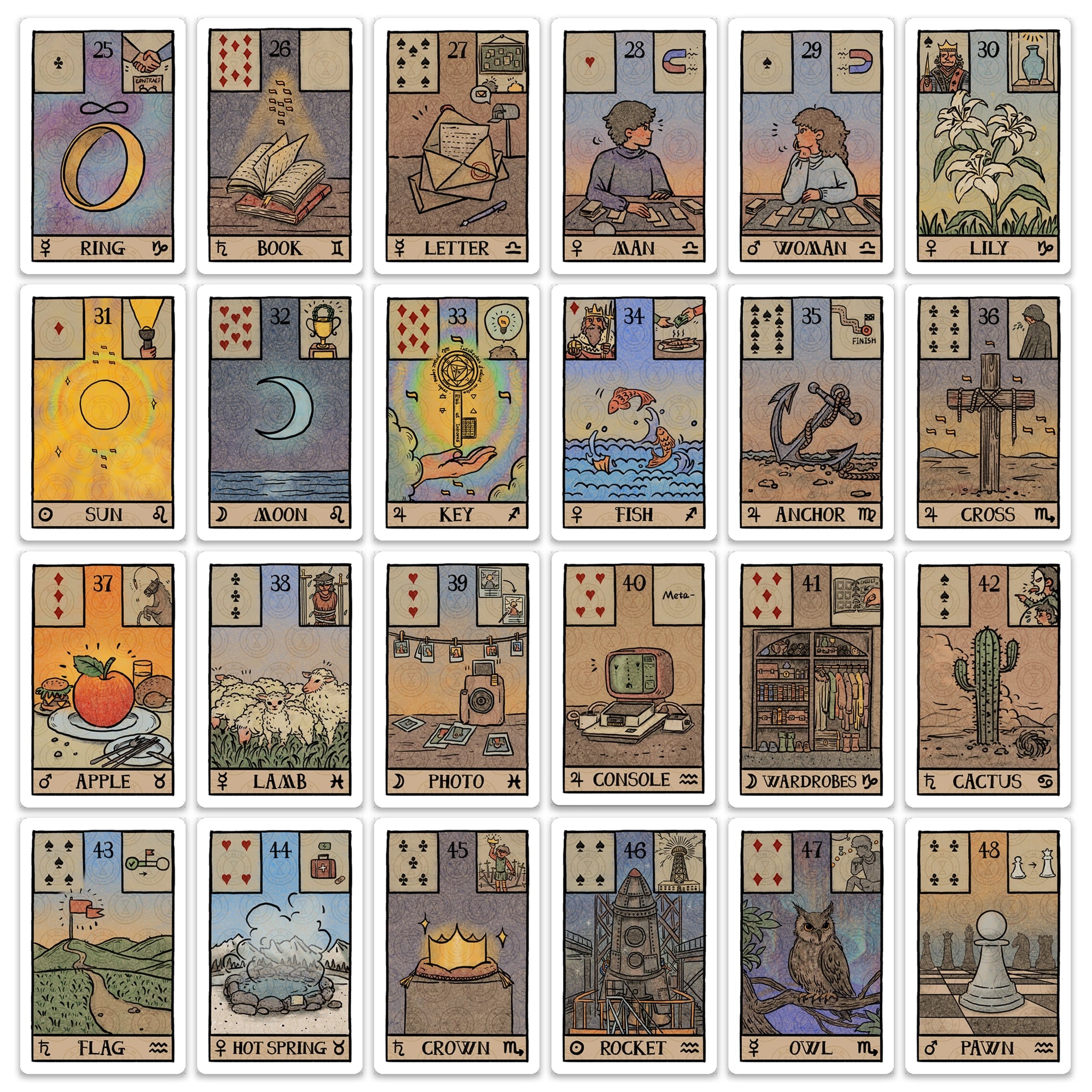 Made in China; digital guidebook only. A tactile, vintage-inspired deck with beautiful ink-on-paper illustrations. This is a classical Lenormand "plus," meaning it has all the classical images, plus 13 alternatives, and 12 bonus cards. It also does include playing card correspondences in the corners.
