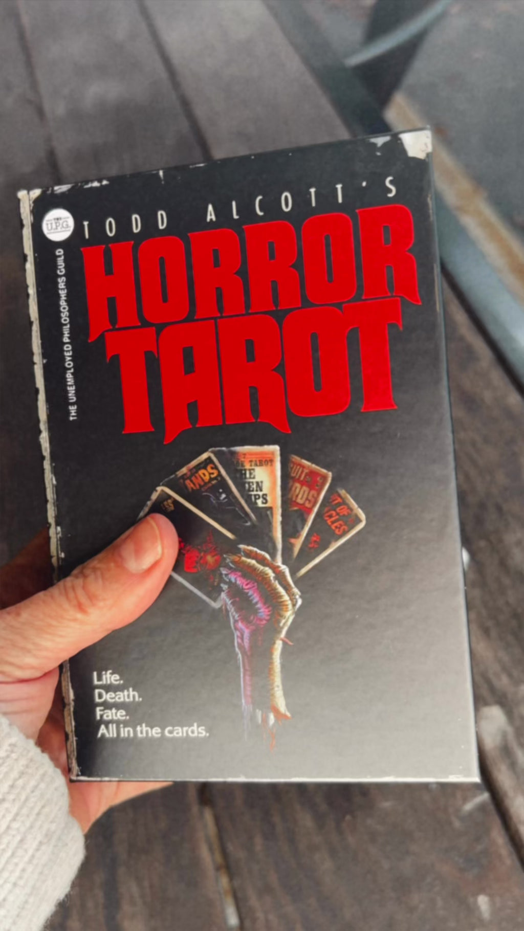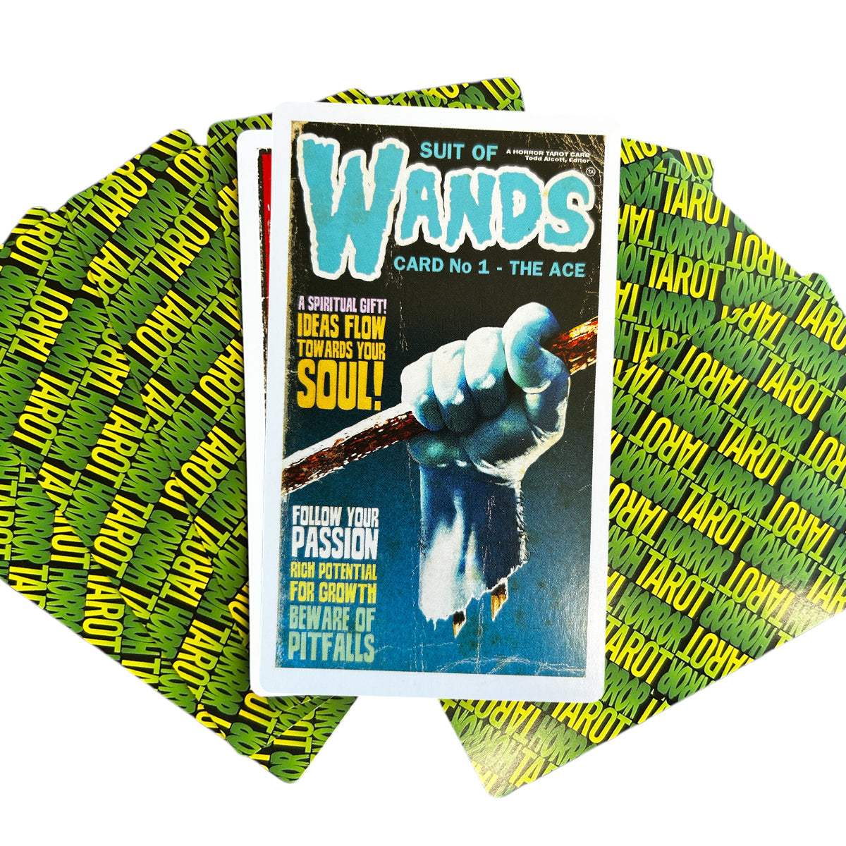 The Horror Tarot deck of 78 chilling cards, inspired by terrifying film, fiction, and comic graphics of the 20th Century, will aid you in divining insights into your darkest mysteries and most unsettling questions.