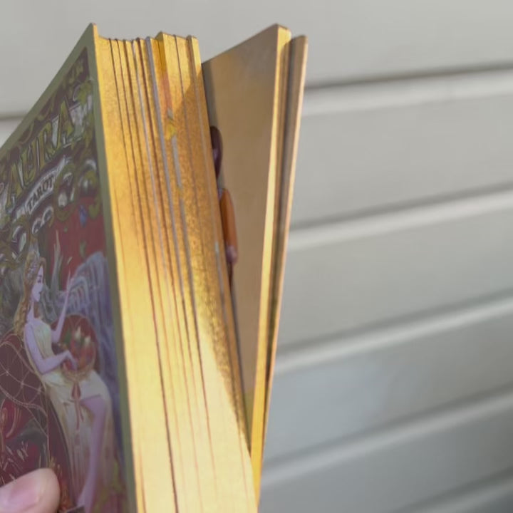 A standard-size tarot with holographic gold details, shimmers in the light as if by magic. 78 gold-edged shimmery cards with a full guidebook in a rigid magnetic box. Inspired by anime with a touch of art nouveau.