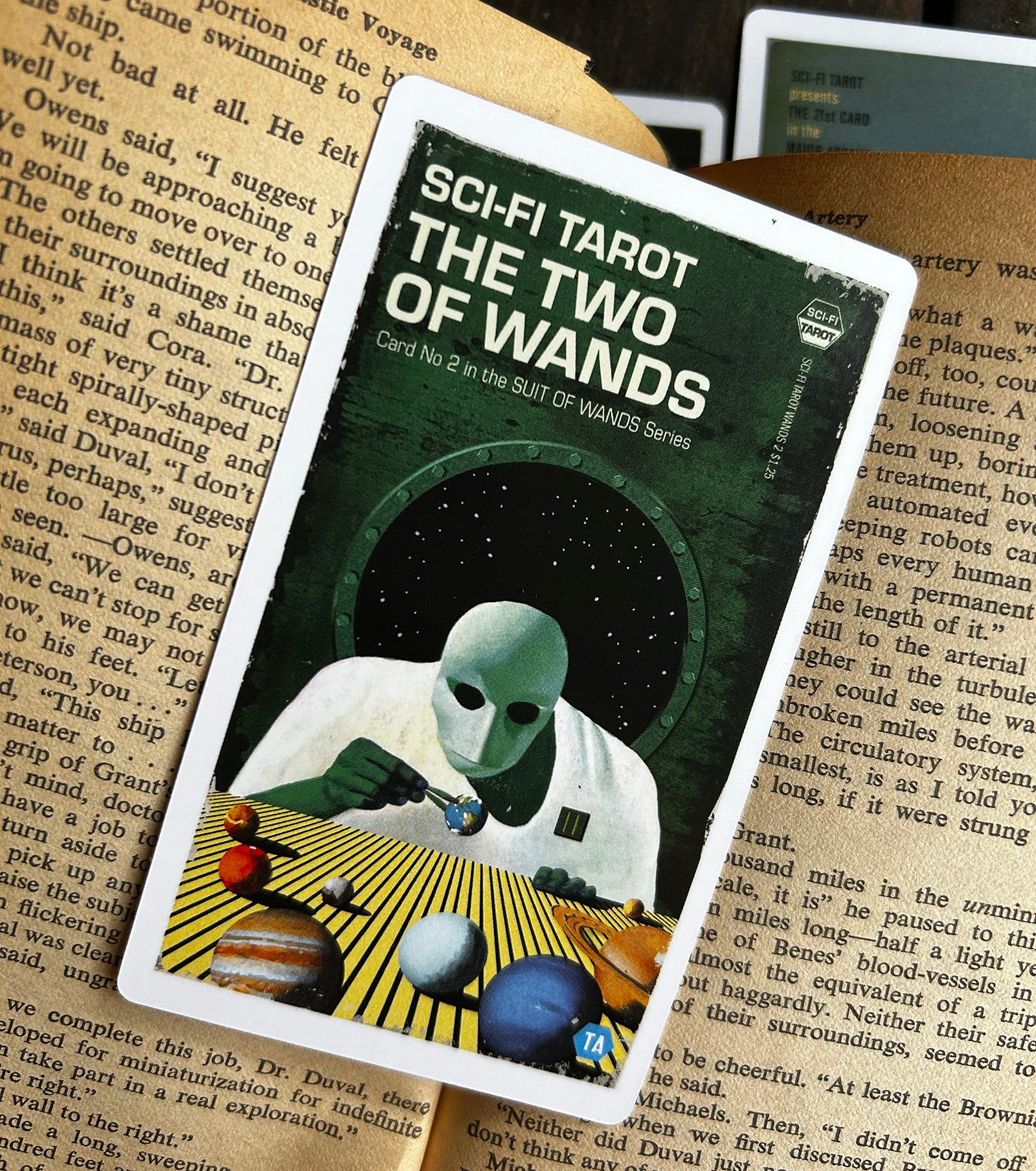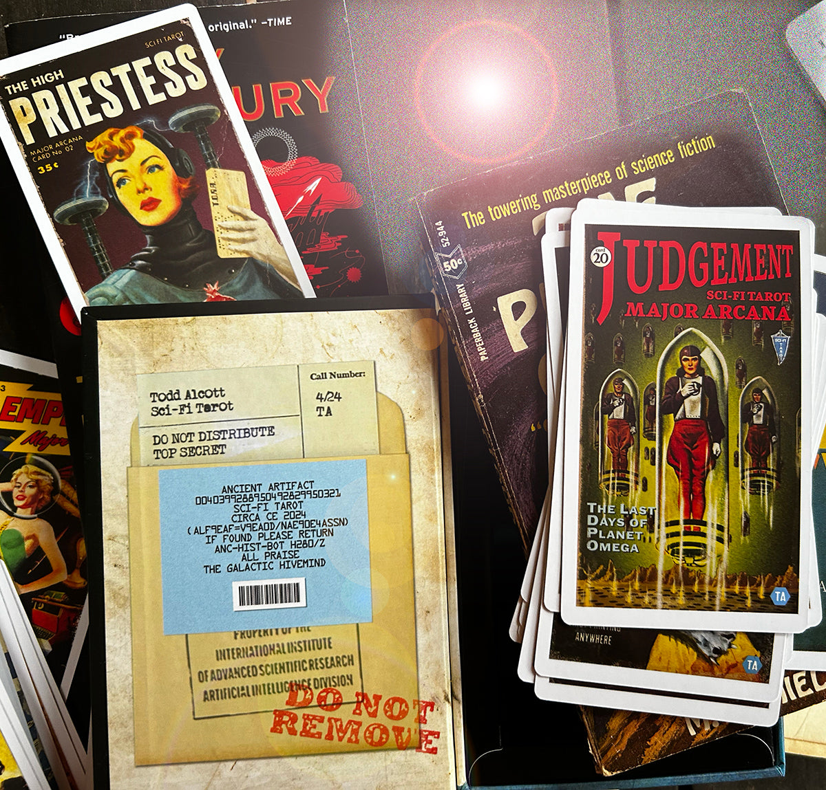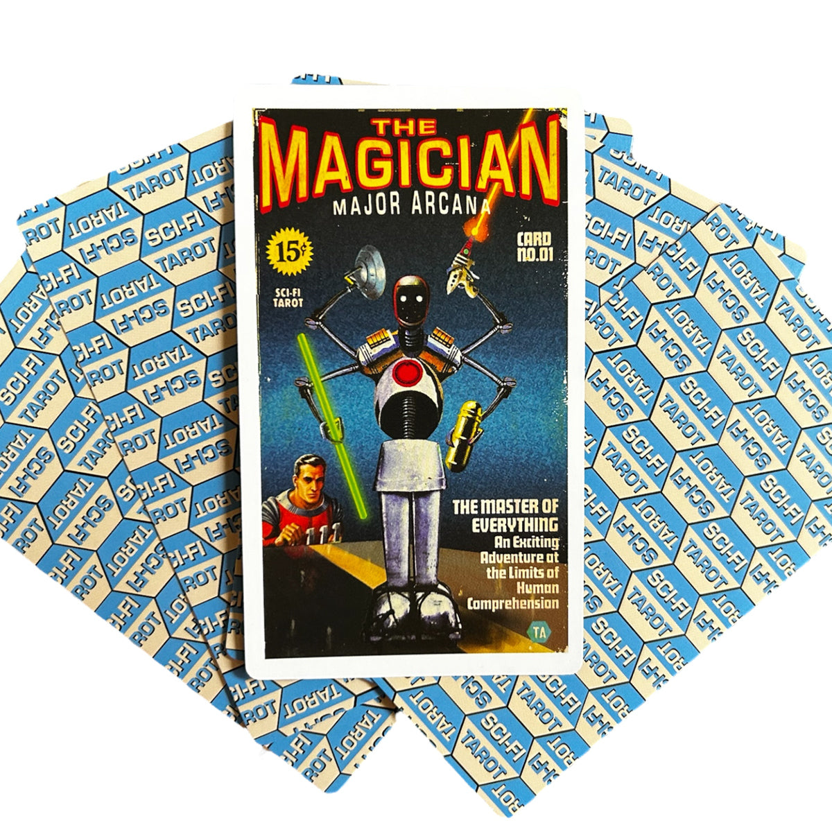 From the creator of the Pulp Tarot and the Horror Tarot returns with this startling glimpse into — the future! Gaze in awe as robots, aliens, astronauts and bug-eyed monsters interact with the immortal imagery of the tarot.