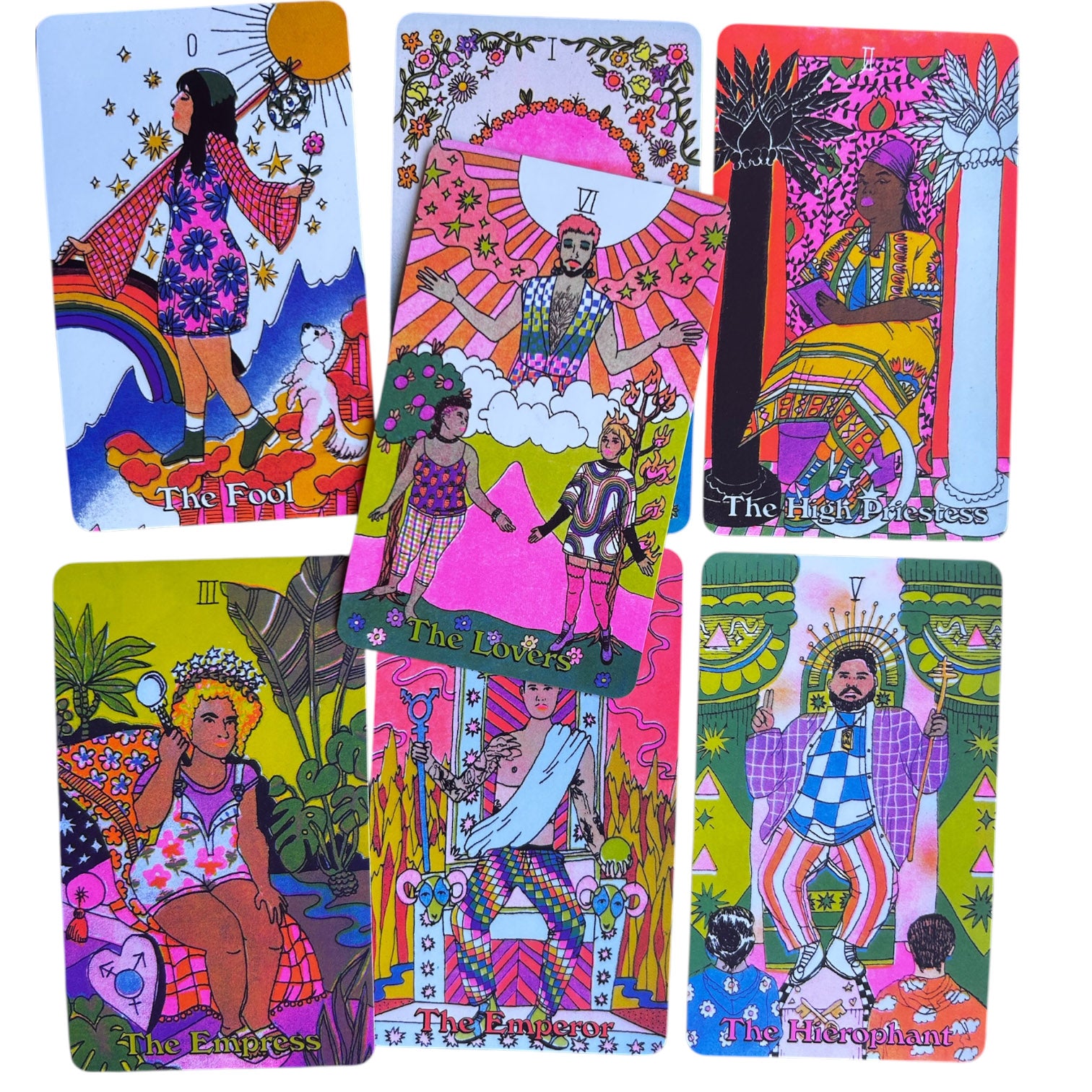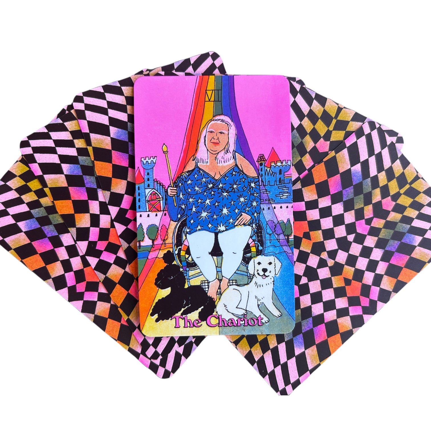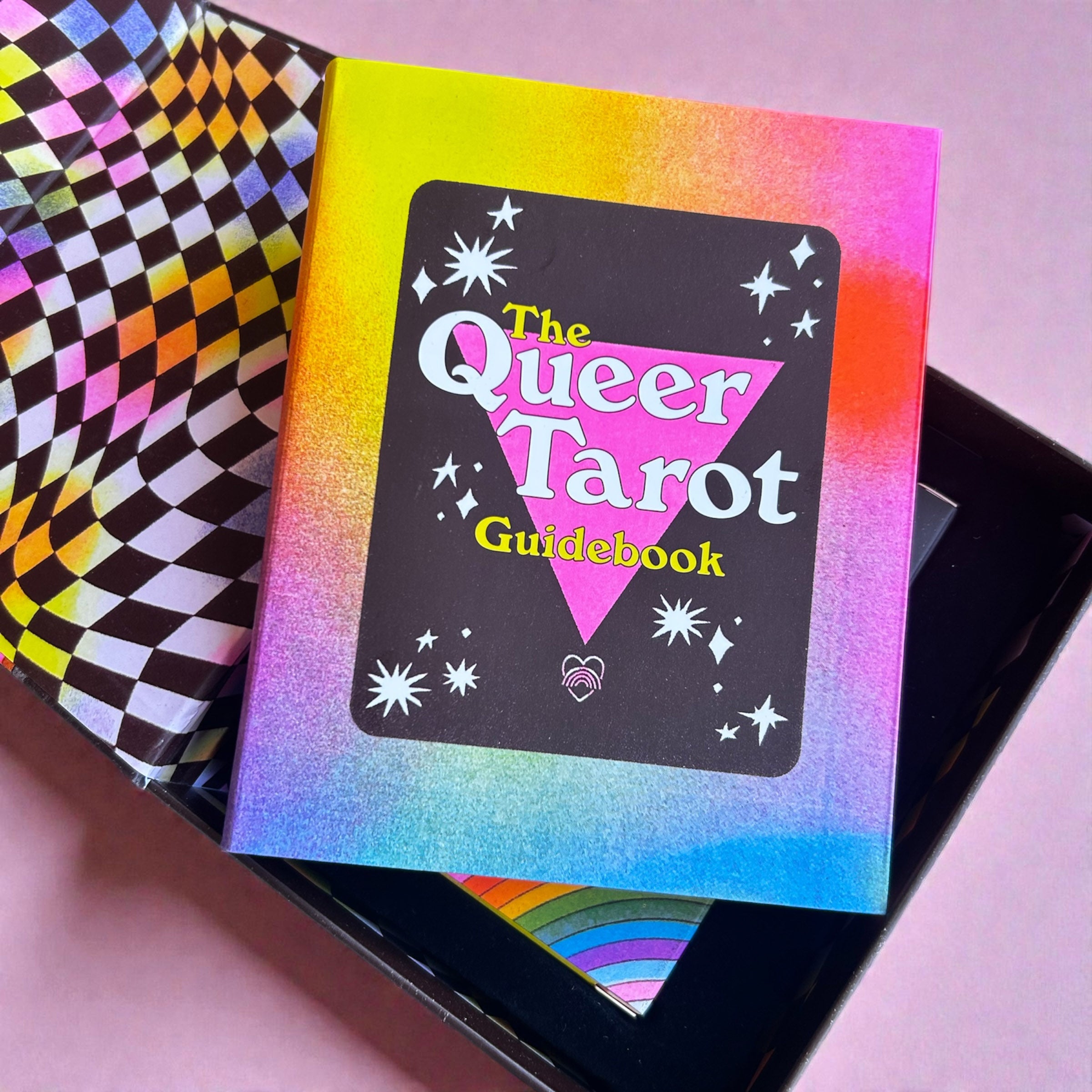 A vibrant, deluxe illustrated tarot deck and guidebook set, centering and celebrating LGBTQ+ identity, created by queer and trans artist team Ash + Chess.