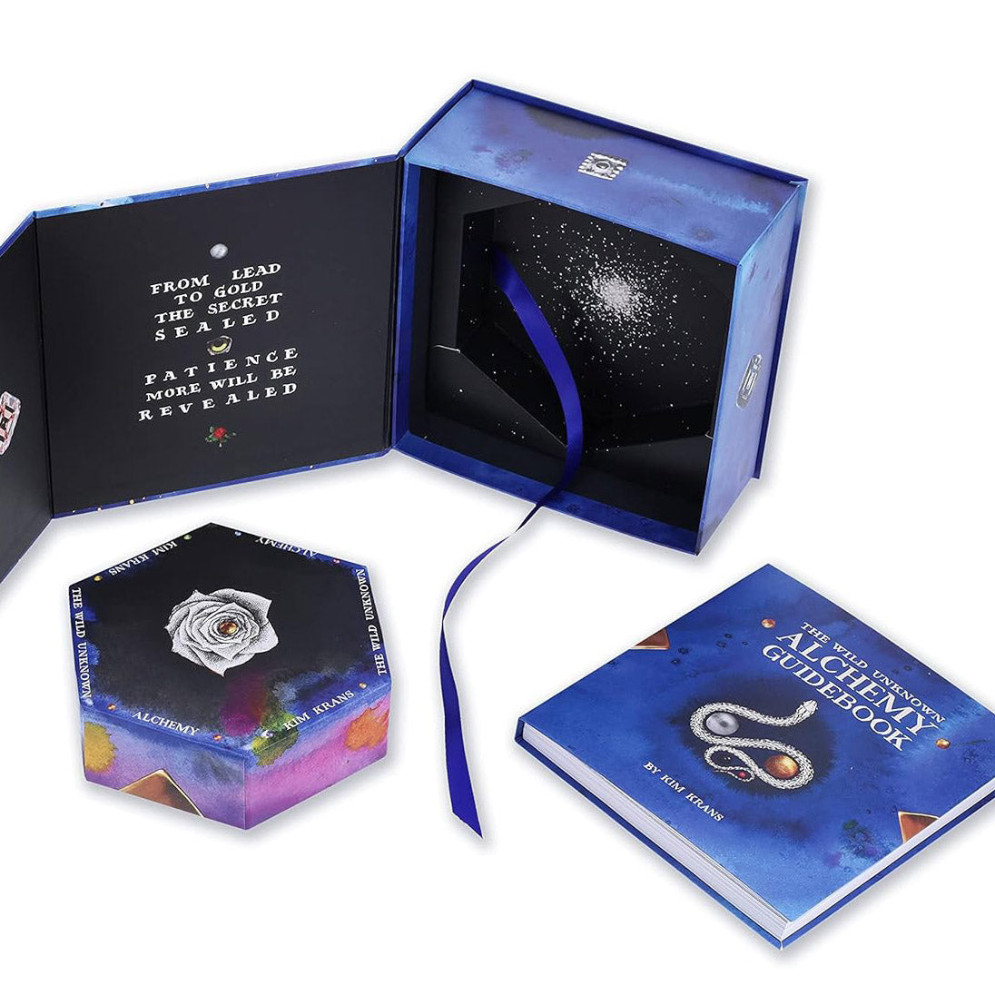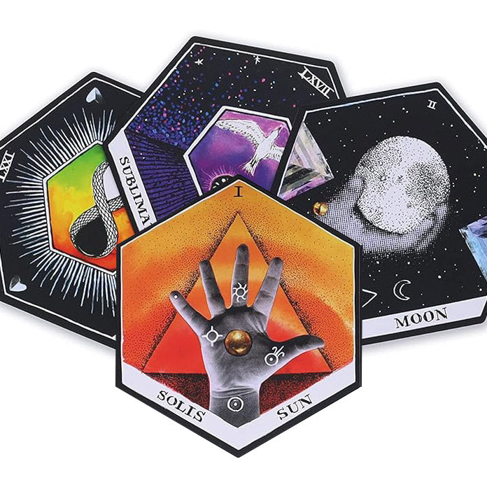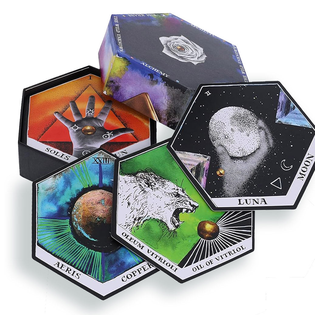 Sitting within a beautiful keepsake box lies a 224-page hand-lettered, fully illustrated guidebook that demystifies the esoteric world of Alchemy, and 71 easy-to-shuffle hexagon cards divided into six suits: The Cosmic Forces, The Colors, The Seasons, The Materials, The Mysteries, and The Operations.